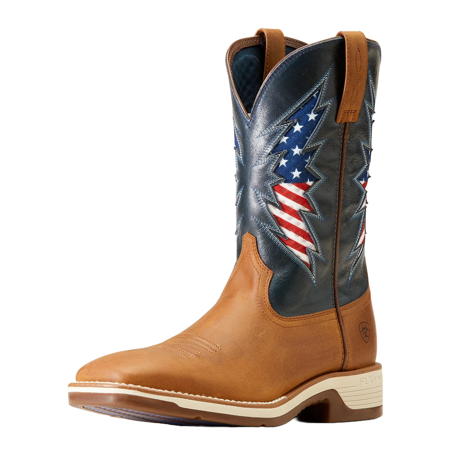 - American flag graphic underlay.